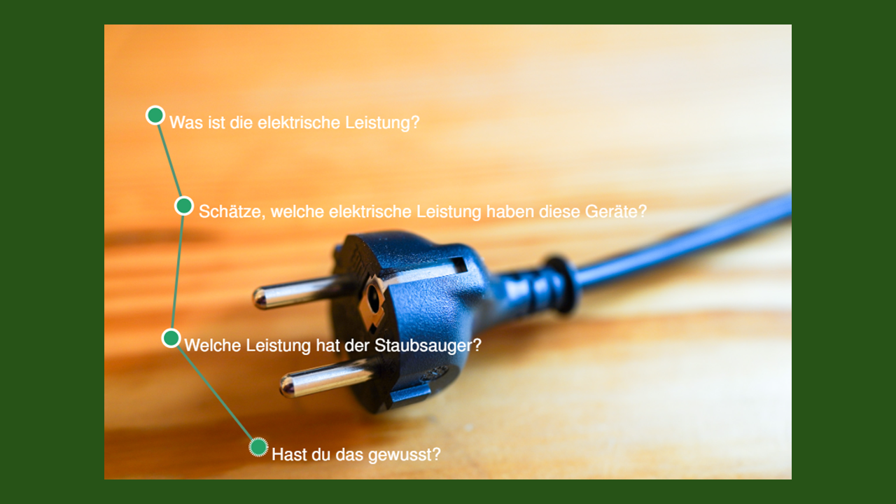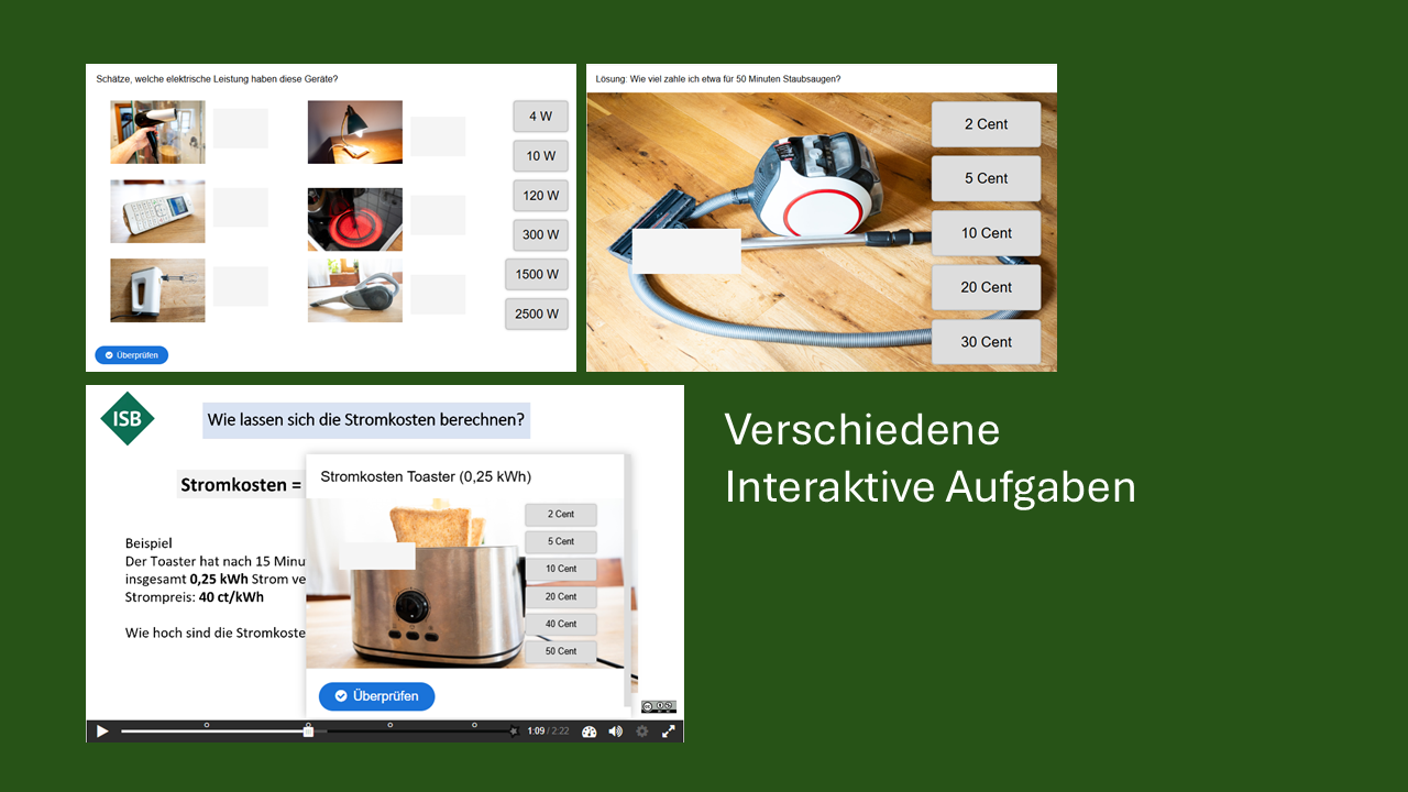 Jedes Unterkapitel leitet die Schülerinnen und Schüler jeweils mit einer Lernlandkarte durch die einzelnen Aufgaben. Dazu finden die Schülerinnen und Schüler Lernvideos mit interaktiven Aufgaben zur Herleitung von Zusammenhängen, Zuordnungen und Berechnungen von Stromverbrauch und Stromkosten am konkreten Beispiel verschiedener elektrischer Haushaltsgeräte.